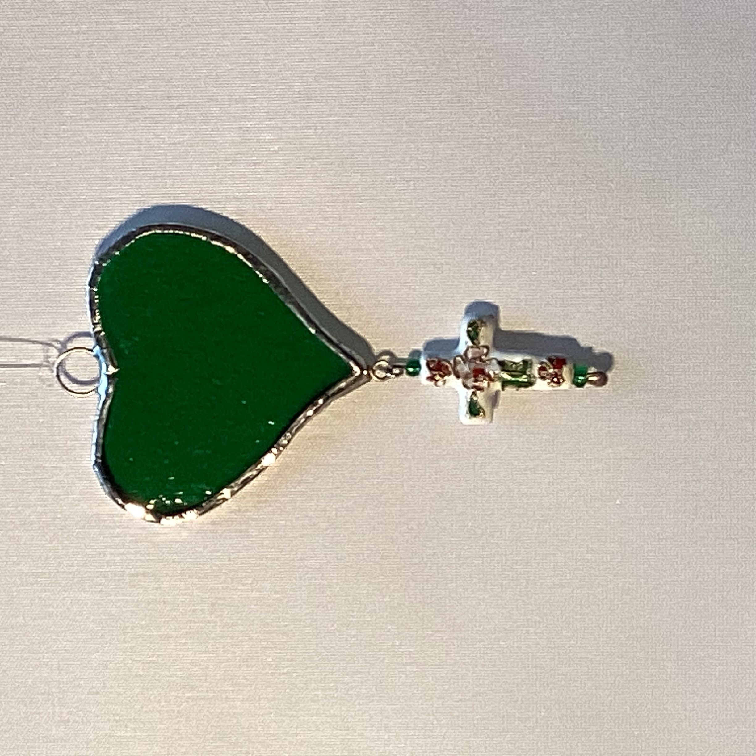 Mooi groen hartje met een wit bedeltje eraan. Glasinlood groen hart met wit kruis. Een mooi groen hart met een wit kruis bedeltje. Een kado voor de liefde of voor valentijnsdag gecombineerd met met een klein kruis. We hebben meerdere soorten en kleuren in onze glasinloodkado webshop.